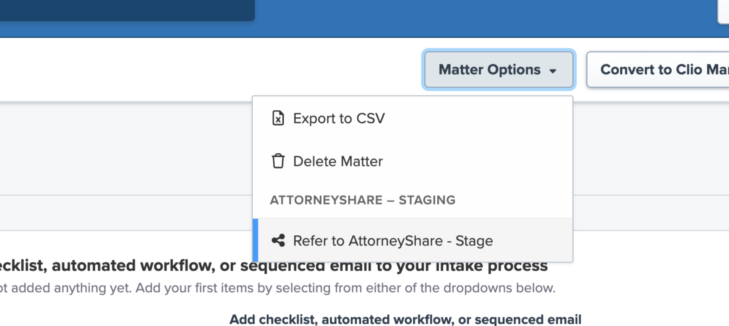 Once connected, you will see "Refer to Attorney Share" as a new selection in the "Matter Options" dropdown.
