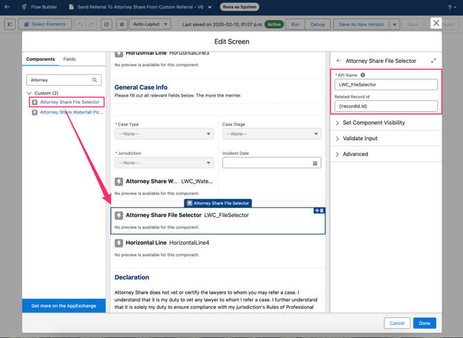 Provide an API name for the component that makes sense - we will be referencing this component later in the flow so ensure its naming convention is easy to understand. We have gone with LWC_FileSelector in this example. You will also need to pass in a reference to your referral’s record id via the expression